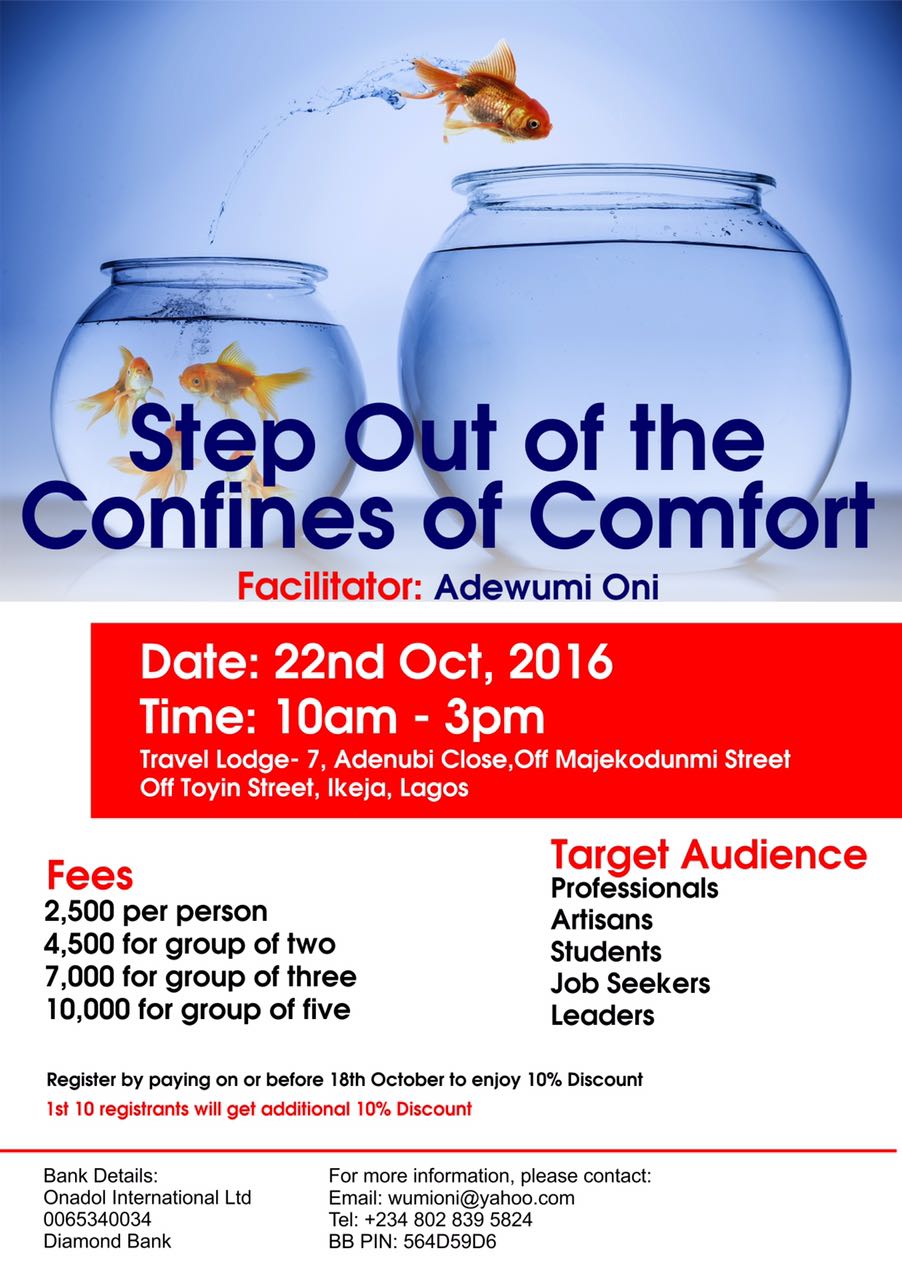 Have you registered for the ‘Step Out of the Confines of Comfort’ seminar? It is guaranteed to be a life changing experience. There will also be opportunity to have one on one session. Don’t miss it.