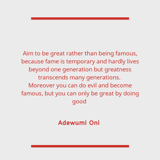 It is better to be great than be famous because you cannot be great without touching lives while you can be famous without touching lives!Dear friends and followers, today’s post will be the last for the year 2019, daily reflection will resume on 6th January 2020, and until then, stay strong and keep touching lives.Merry Christmas and Happy New Year in advance.#onadol #adewumioni #godspeace #wisdom #lifecoach #goodhabits #faith #grace #motivation #fulfilment #positivevibes #hope #beautiful #success #dailyreflection #healing #saynotodrugs #saynotorape #successcoach #fashion #positivemind#najacampus #naija #lagos #goodthoughts #wordsofwisdom #wisdomquotes #dailyquotes #character #quotesoftheday