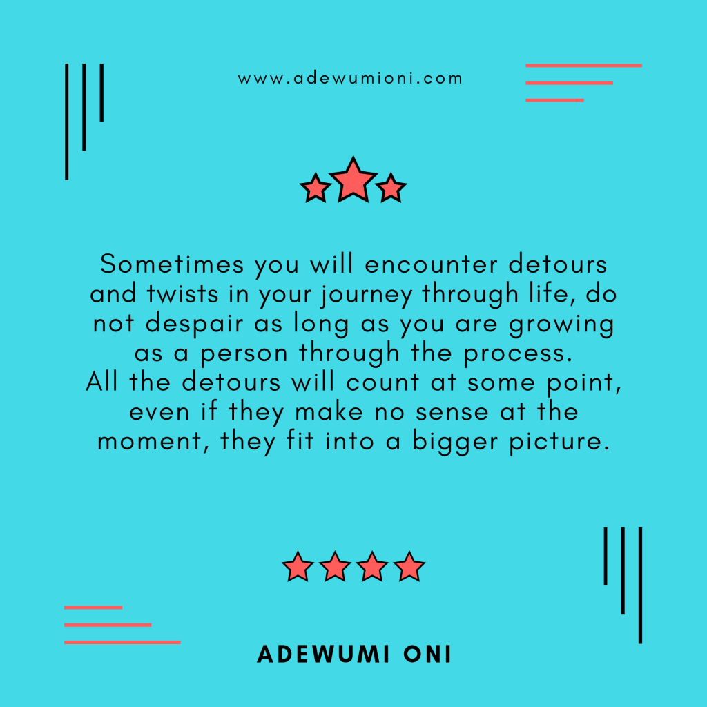 Daily Reflection – 01072020 July 1, 2020 / Adewumi Oni / Leave a comment Even when it seems you are making a detour, ensure you are growing.#onadol #adewumioni #godspeace #wisdom #lifecoach #covid-19 #faith #grace GeorgeFloyd #fulfilment #positivevibes #success #dailyreflection #healing #saynotodrugs #saynotorape #saynotoracism #fashion #positivemind #najacampus #beauty #lagos #parenting #wordsofwisdom #wisdomquotes #dailyquotes #character #quotesoftheday #justice