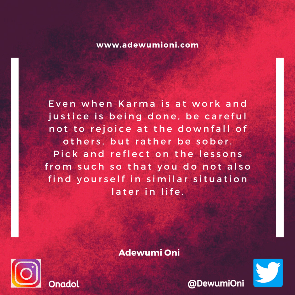Karma respects no one, rather than rejoice when someone is reaping from past actions, learn from their actions so you don’t go through same.