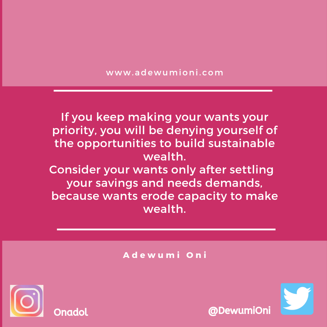 Wants erode the capacity to build a secure future, only consider Wants after you have saved or invested.