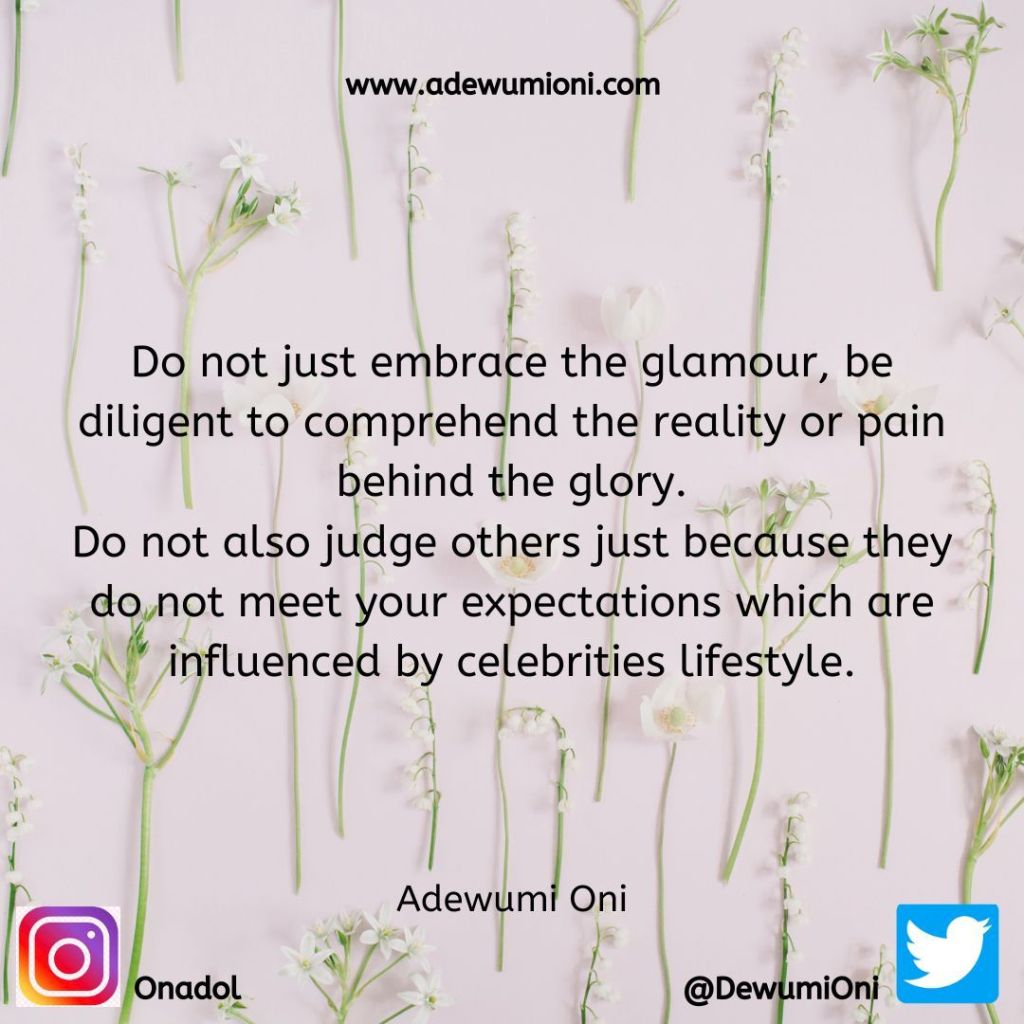 Moreover, do not judge others because their lives do not measure up to the standards you have set based on movies or celebrities. You might miss the opportunity to grow with people who have great potential. Learn to pay the price before enjoying the prize.