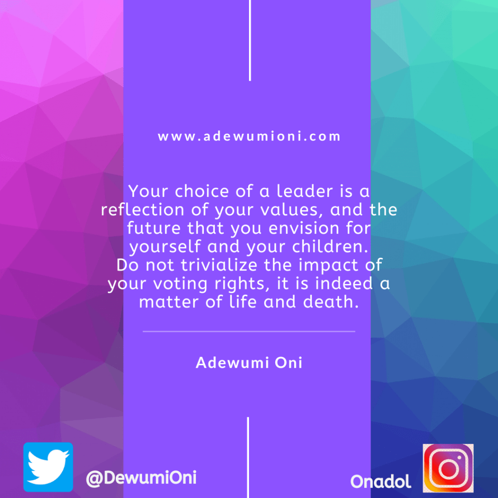 Permit me to talk a bit about politics today, especially in view of next year General Elections in Nigeria. In less than one year from now, we will be casting our votes to decide who represent us at the legislative chambers, our Governors and the President.